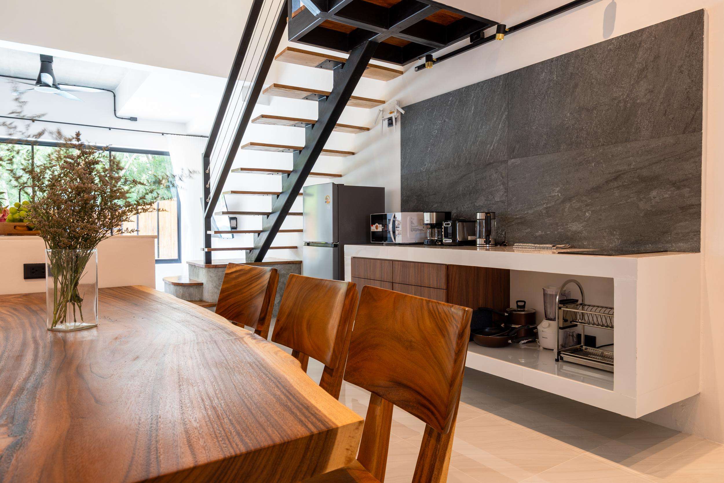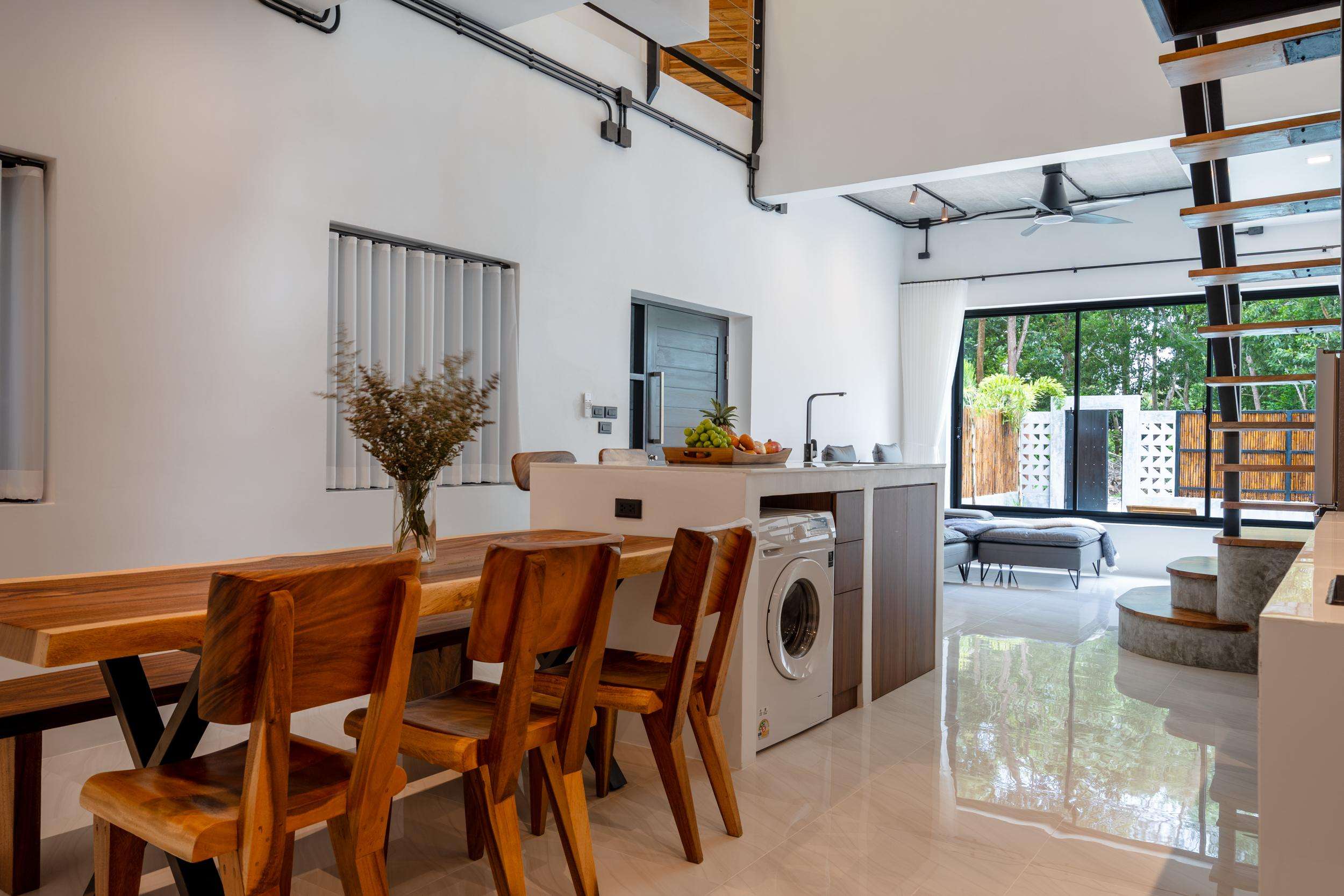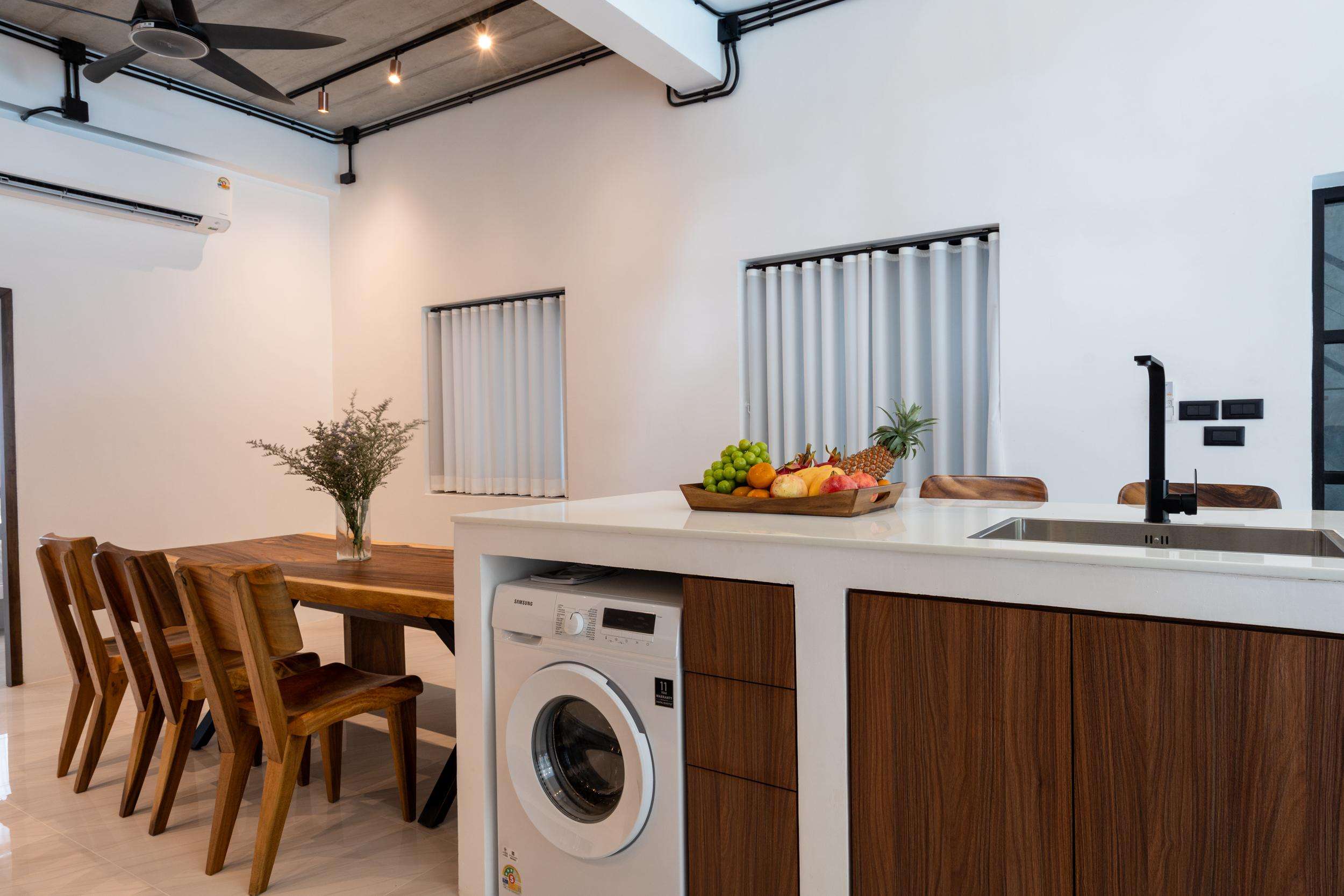 High quality dining table (make from teak wood) seats up to 6 people next to the kitchen area