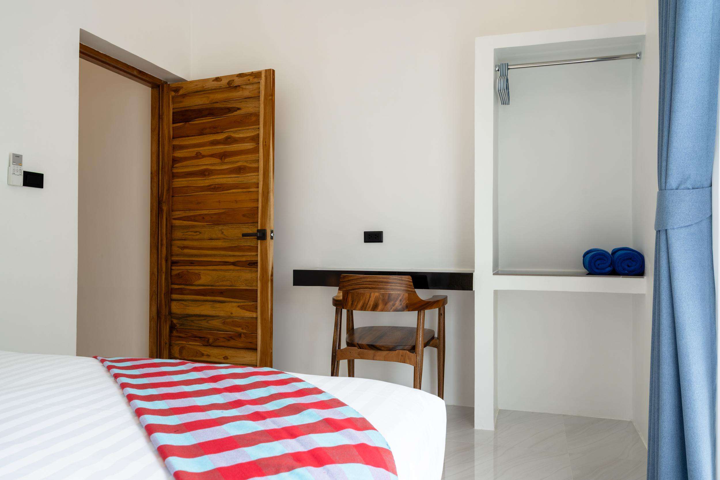 mountain + pool views. Queen size bed with comfortable mattress, plenty of wardrobe space and desk for working.