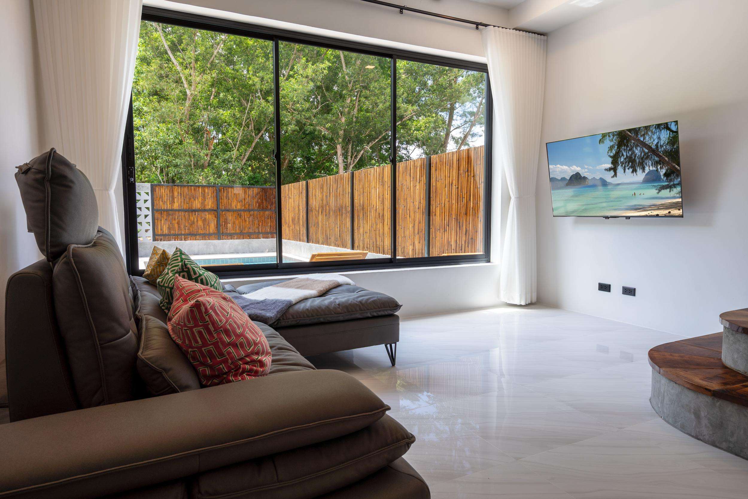A large comfortable sofa faces the pool. Large flat screen Smart TV