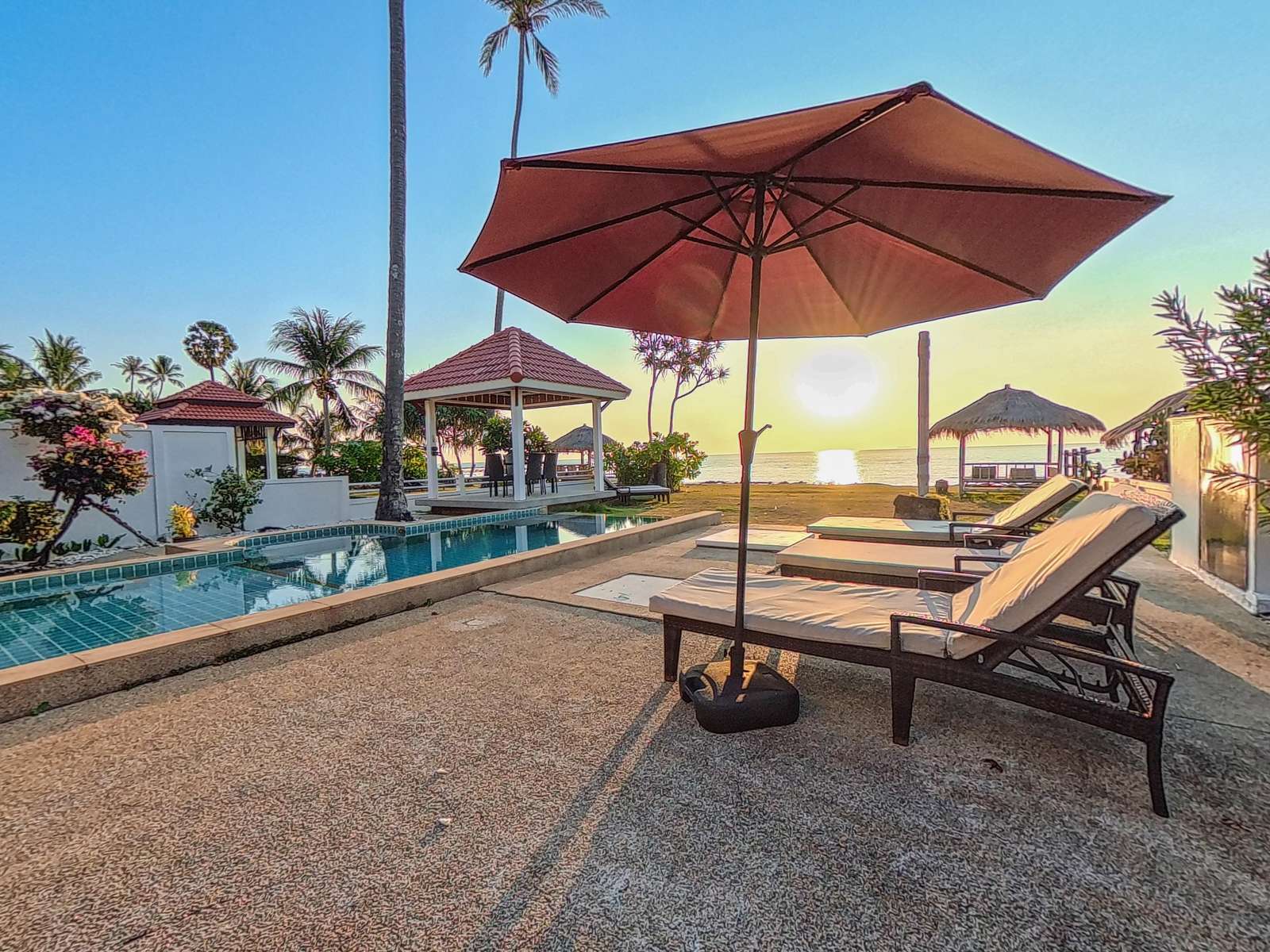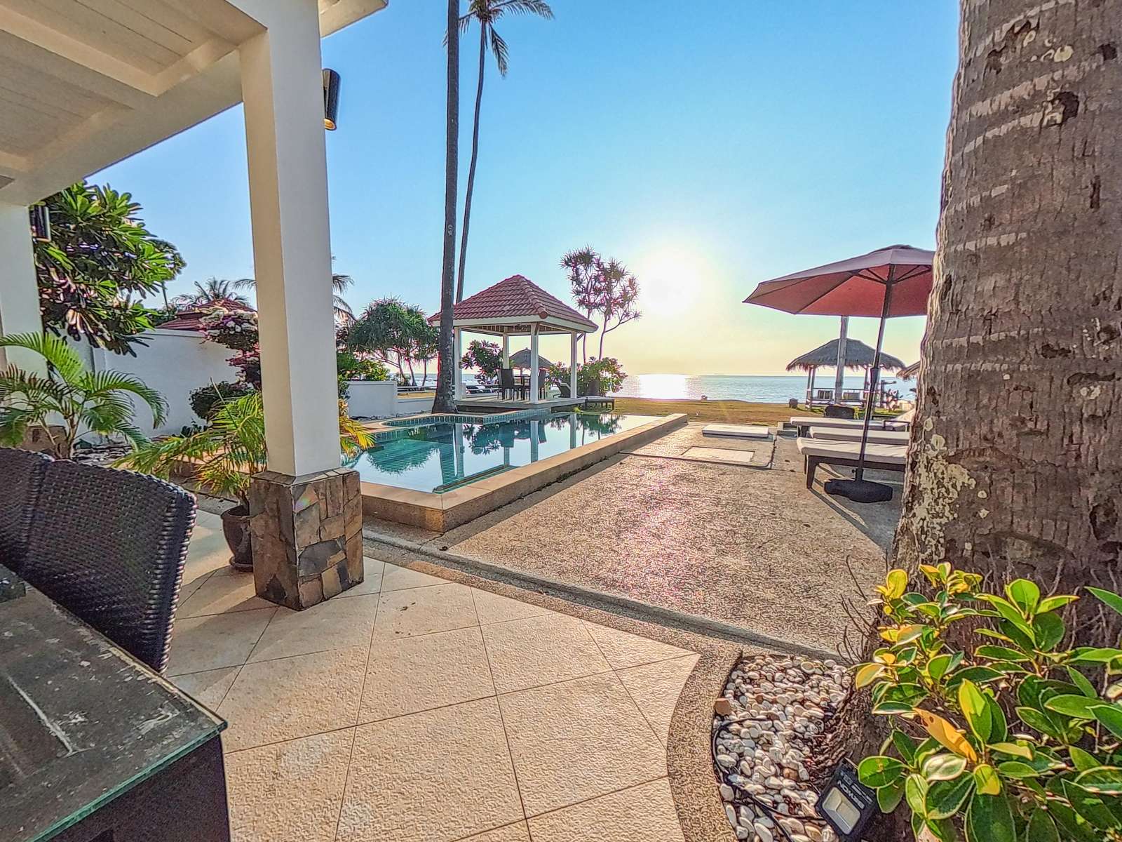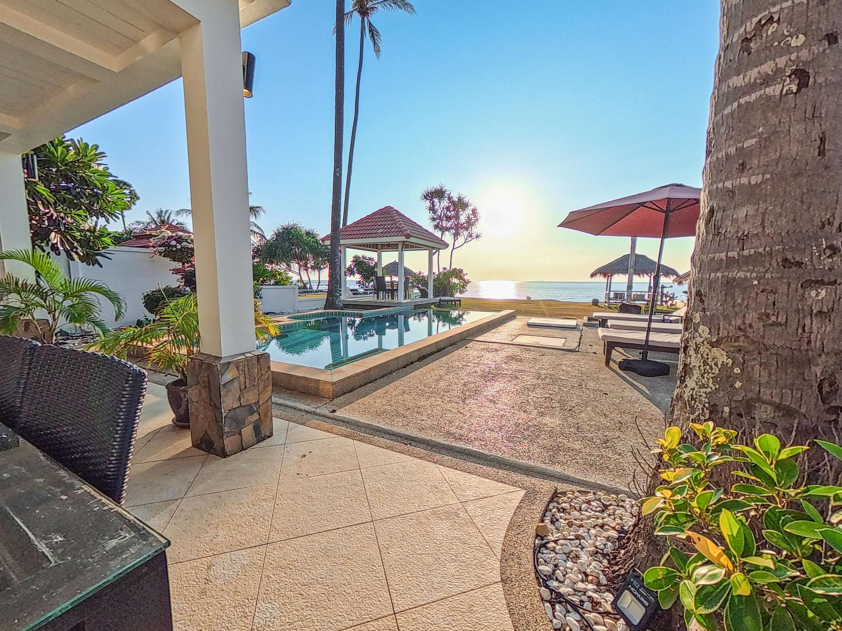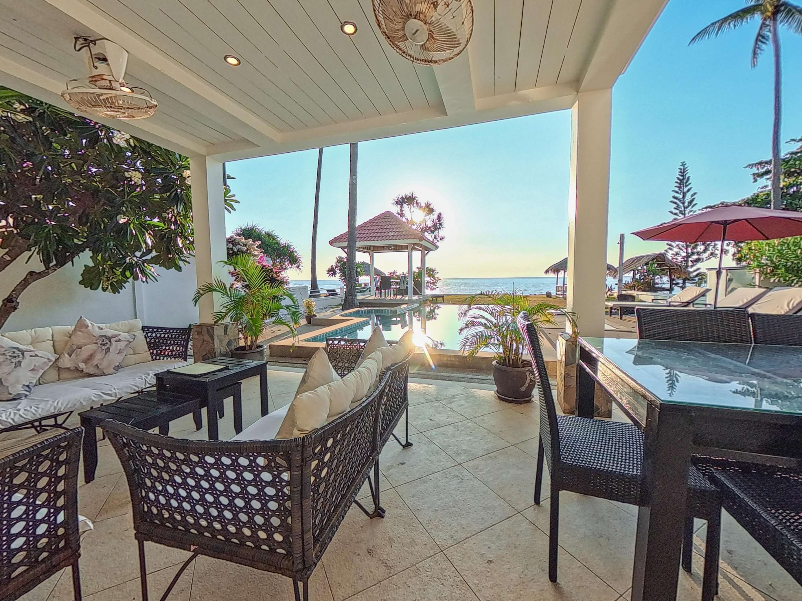 Large covered terrace with private pool, dining table, sofa, sunloungers and fans. Pavilion next to the beach