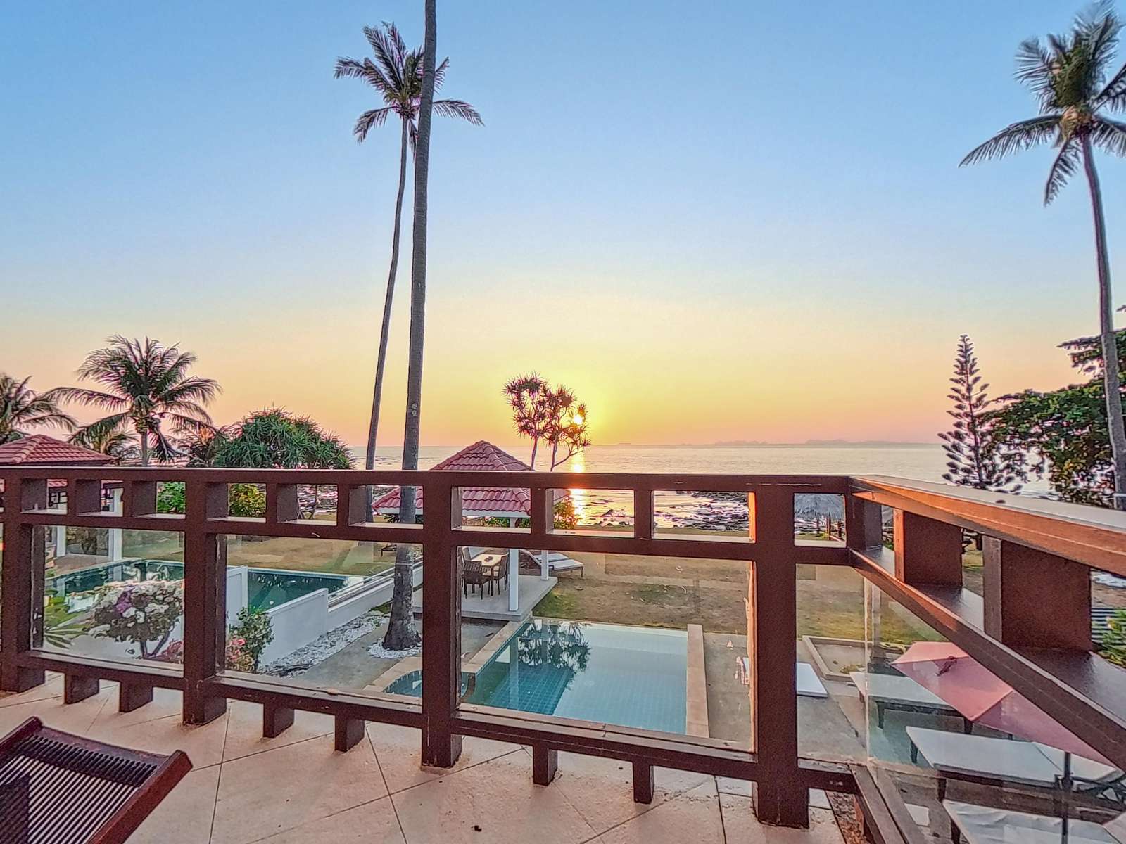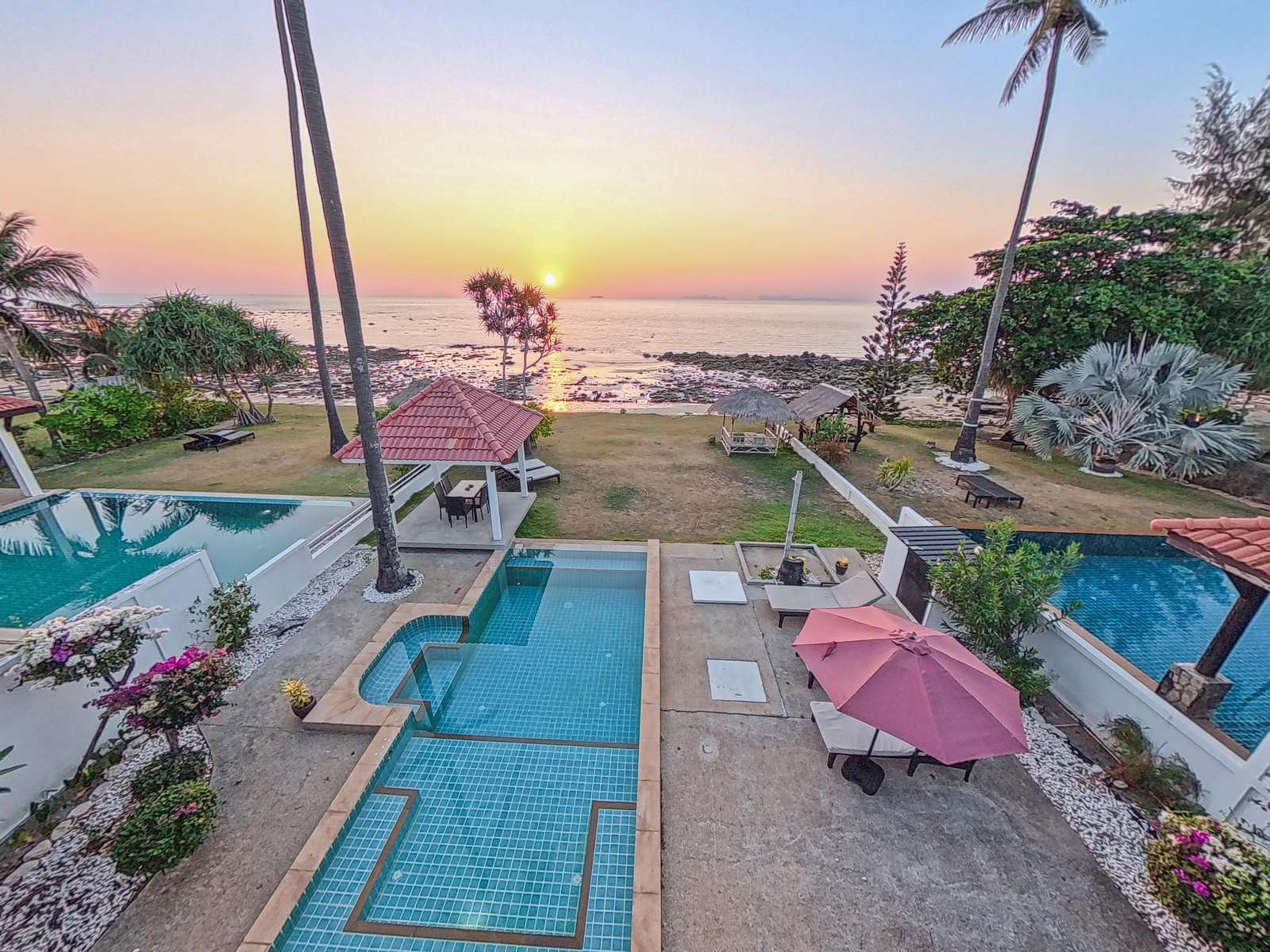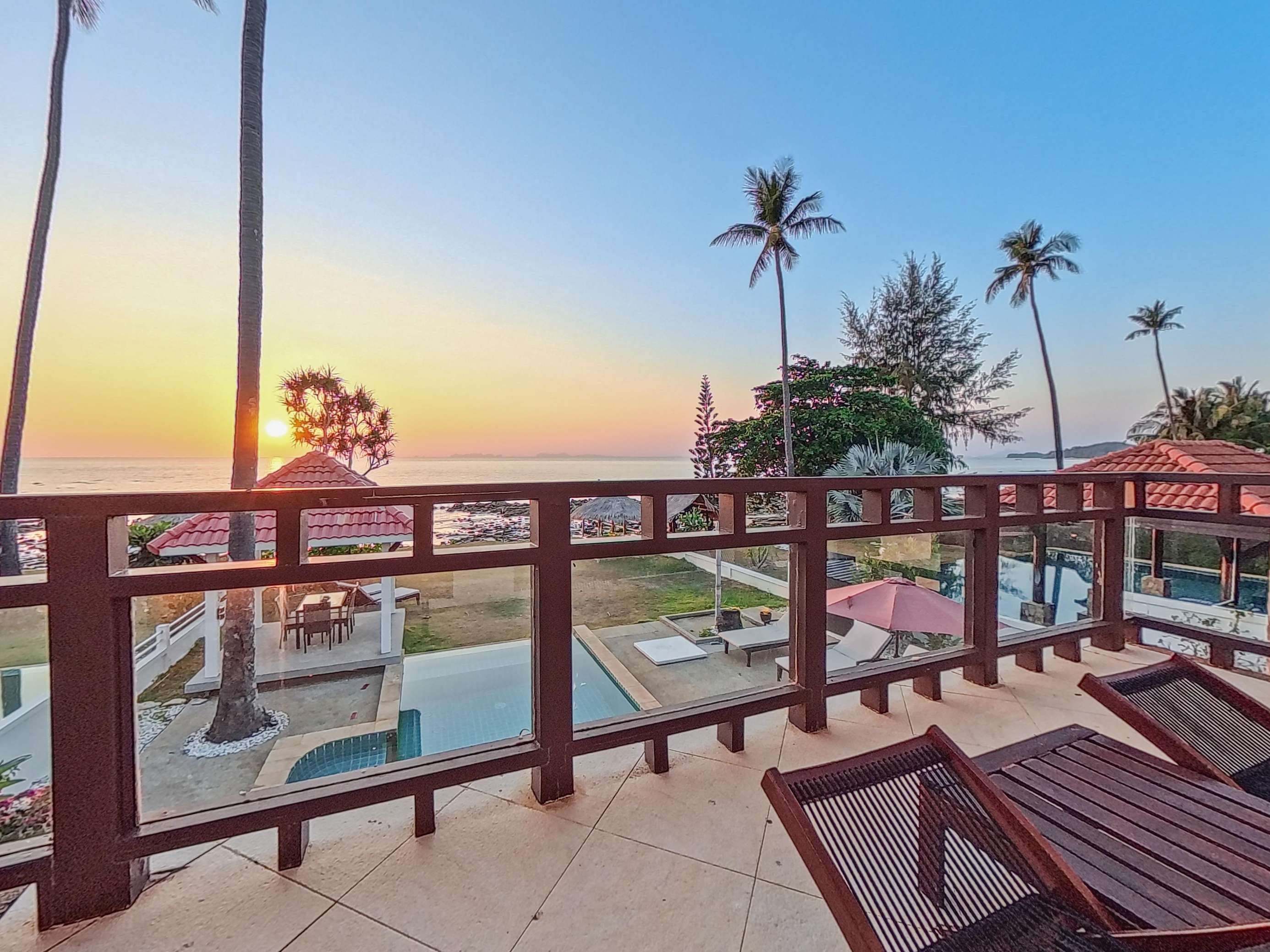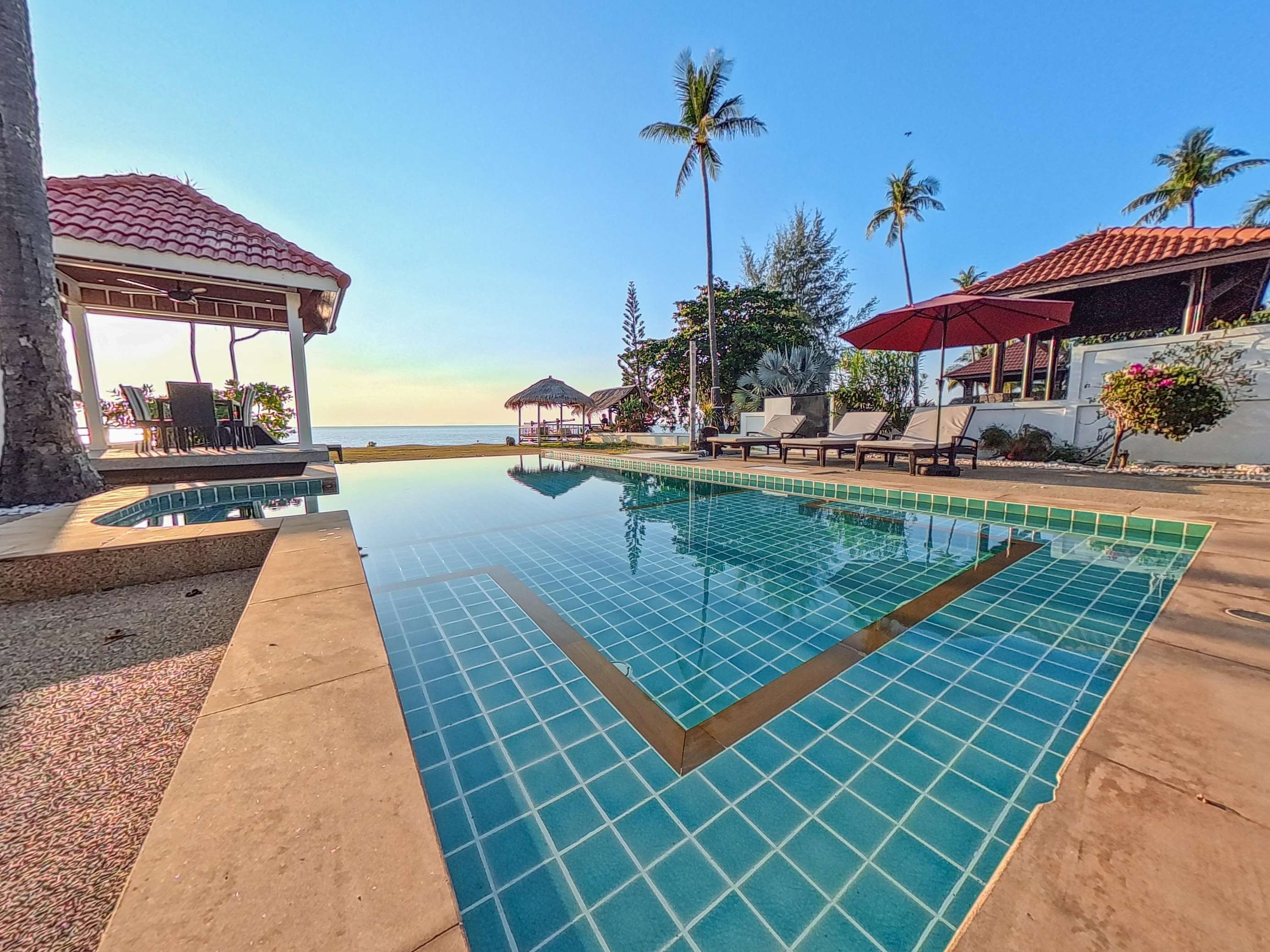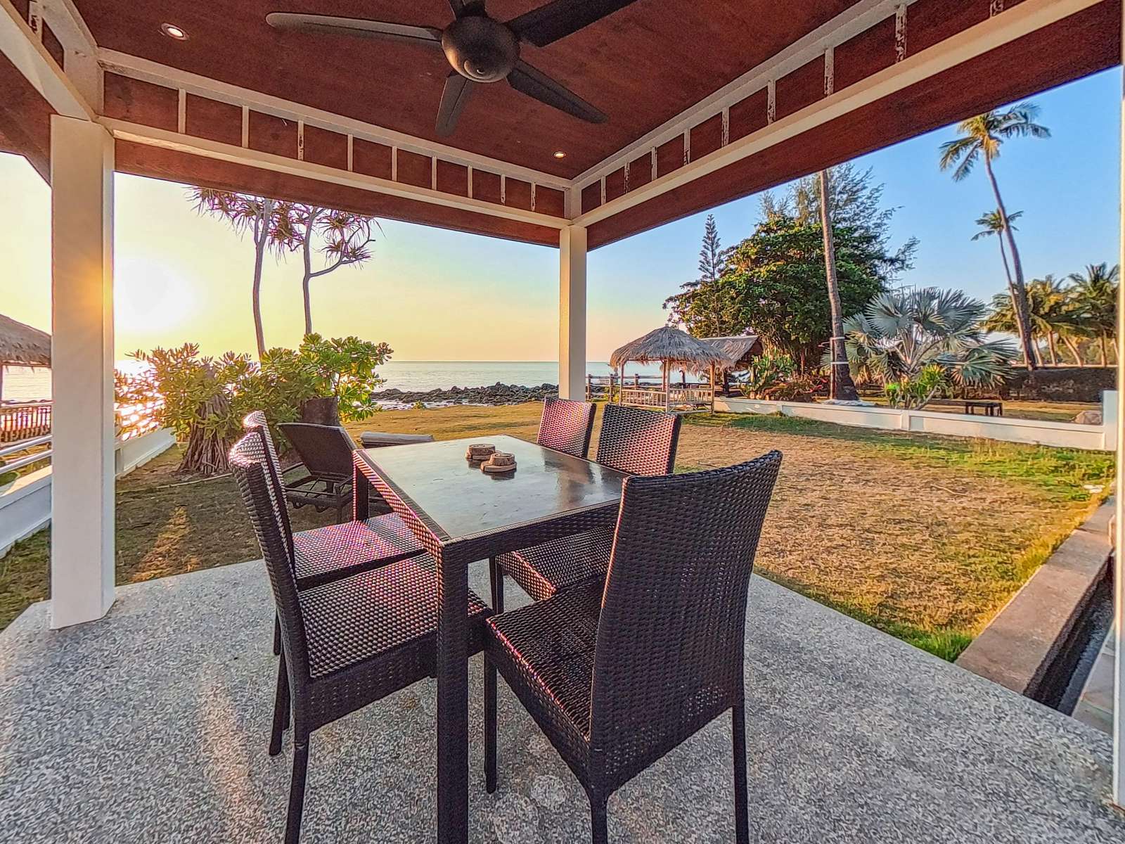 Large covered terrace with private pool, dining table, sofa, sunloungers and fans. Pavilion next to the beach