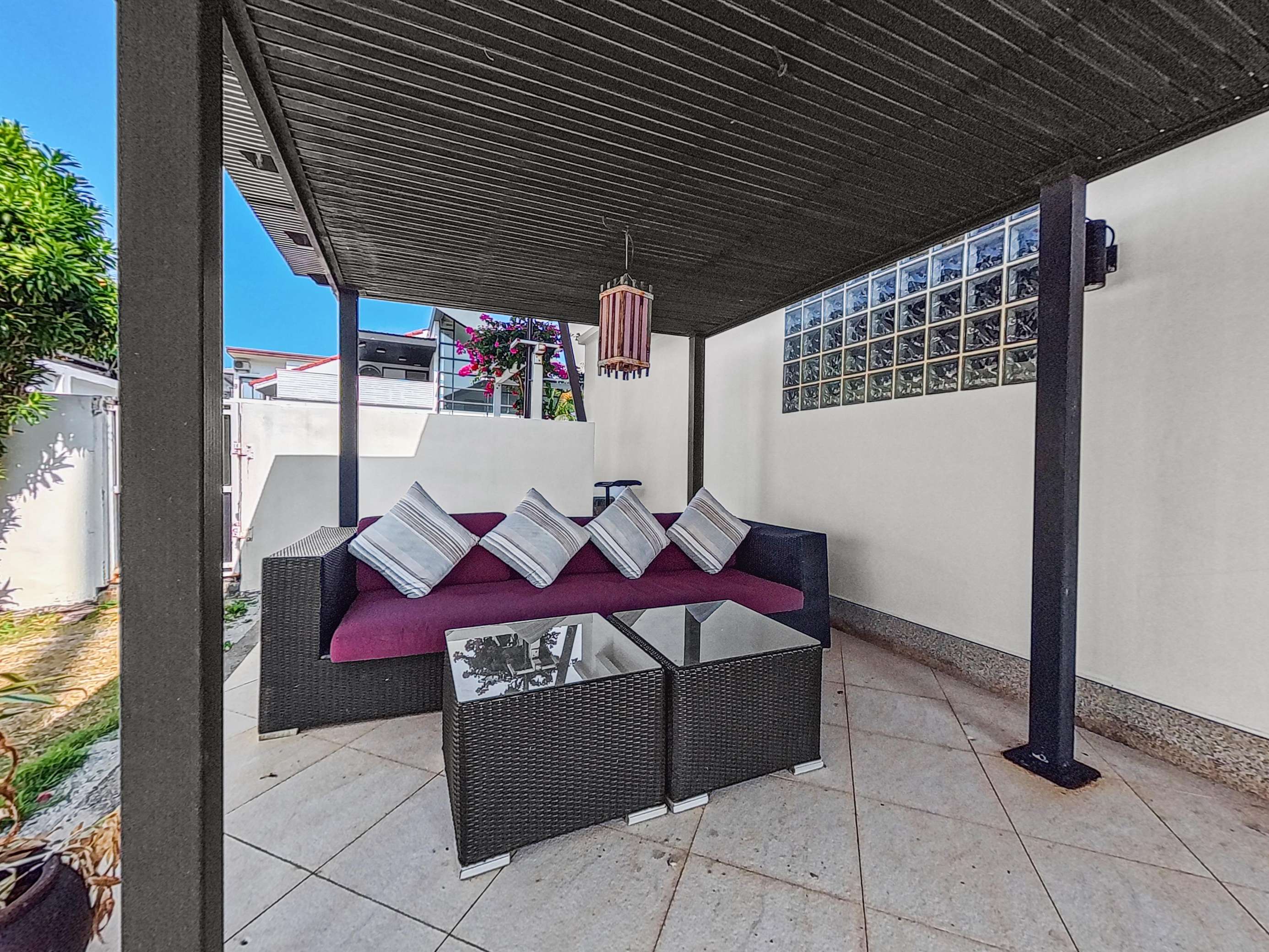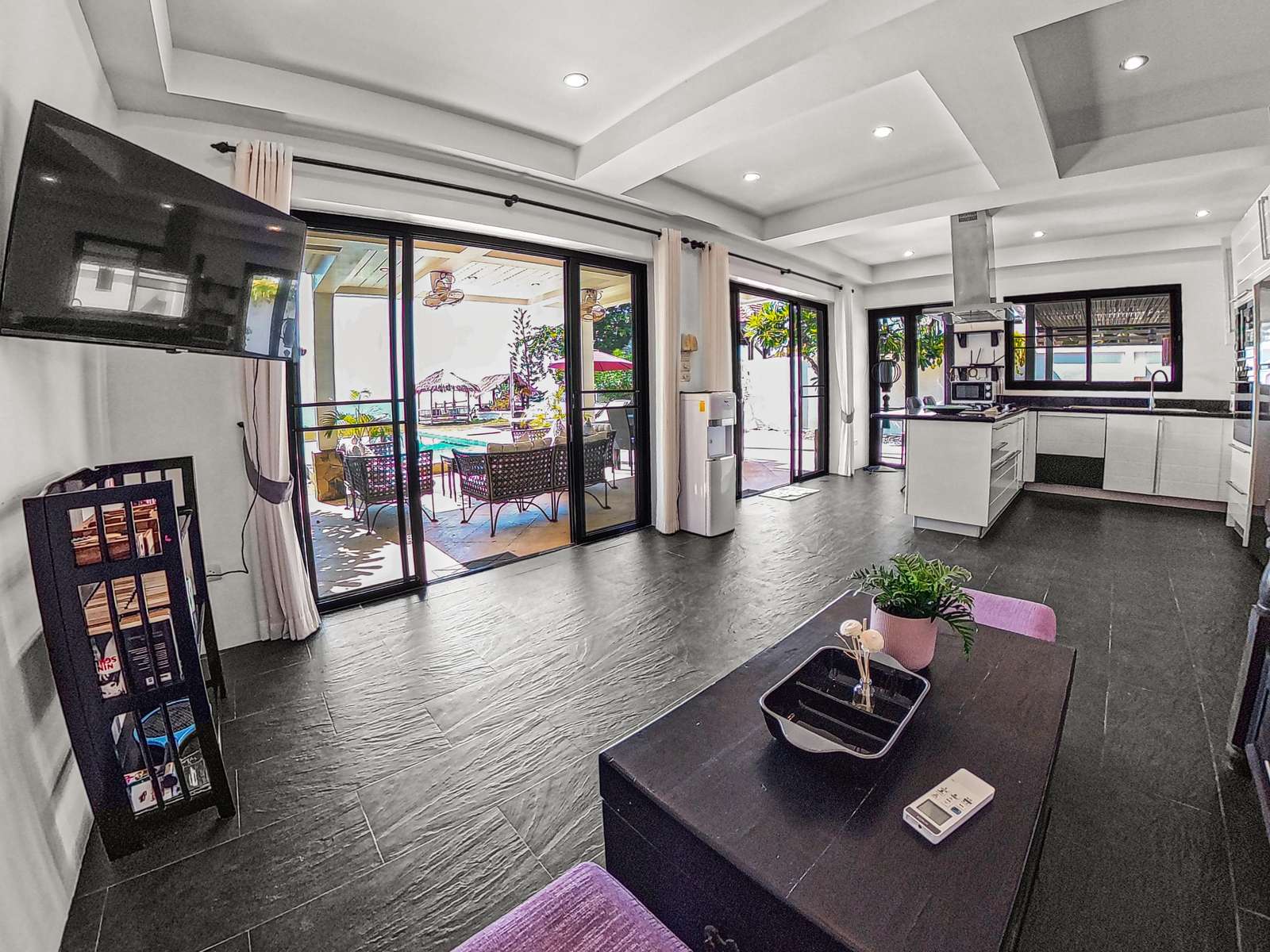 Dining space is outside, under cover near the pool