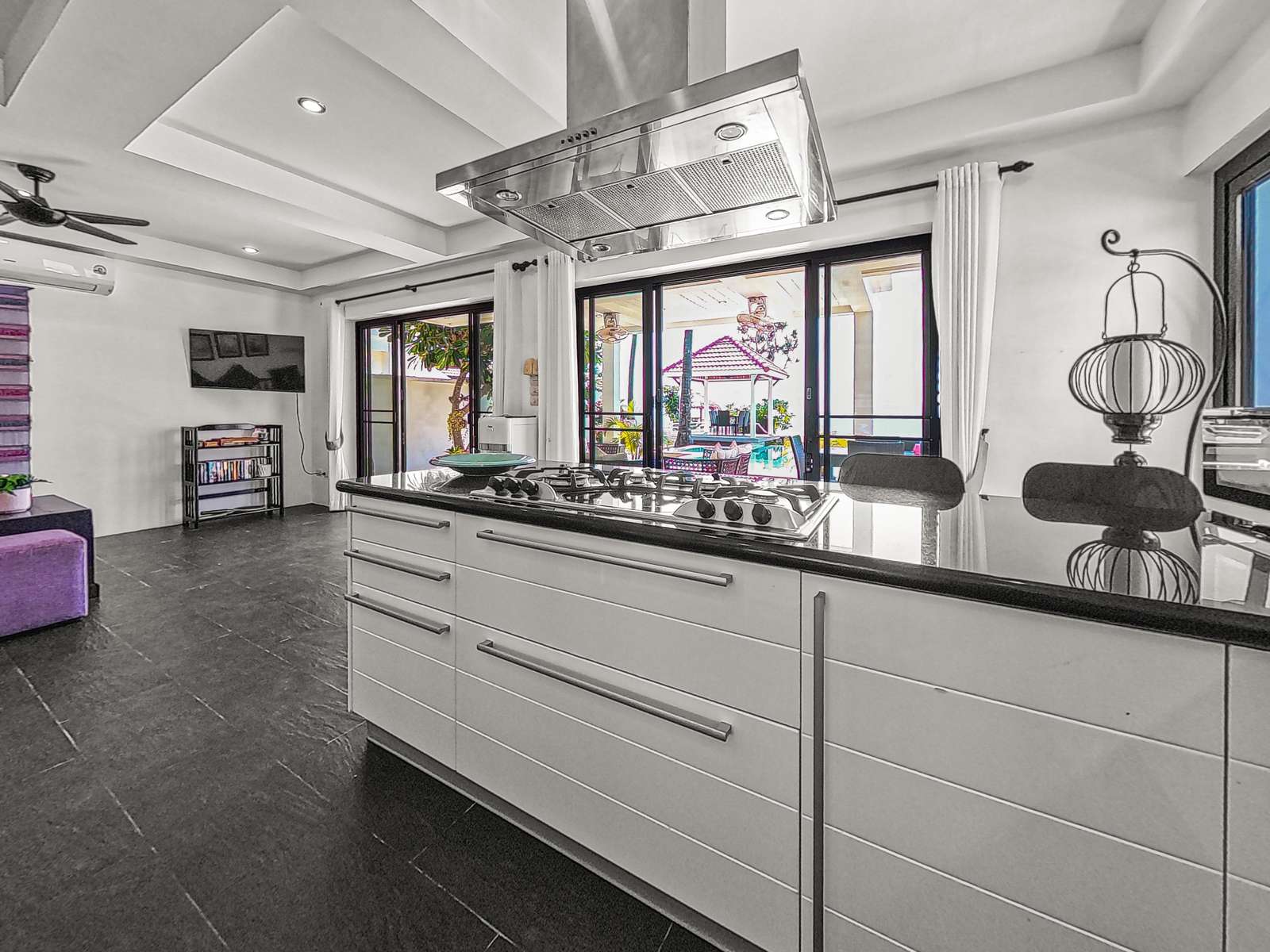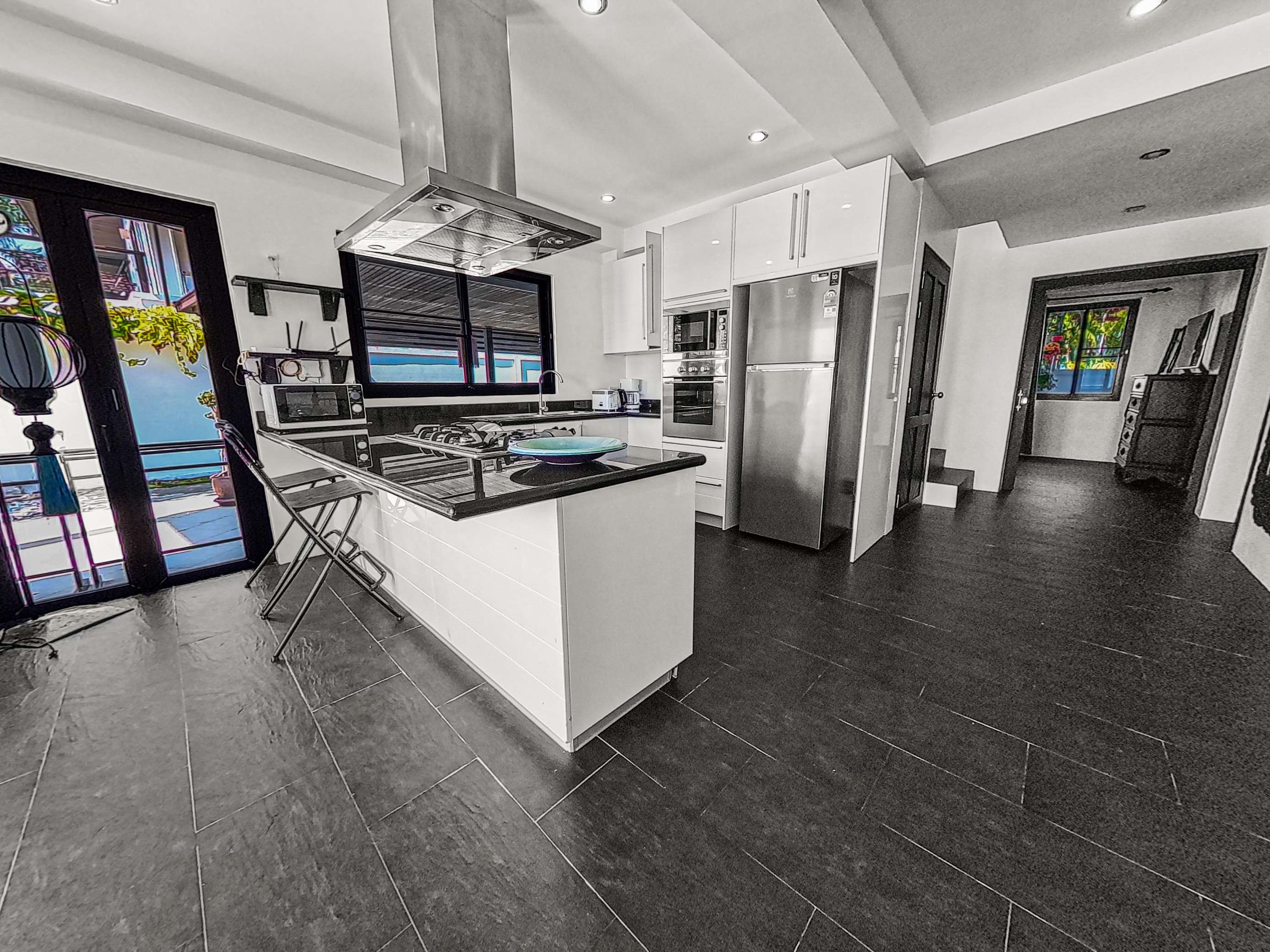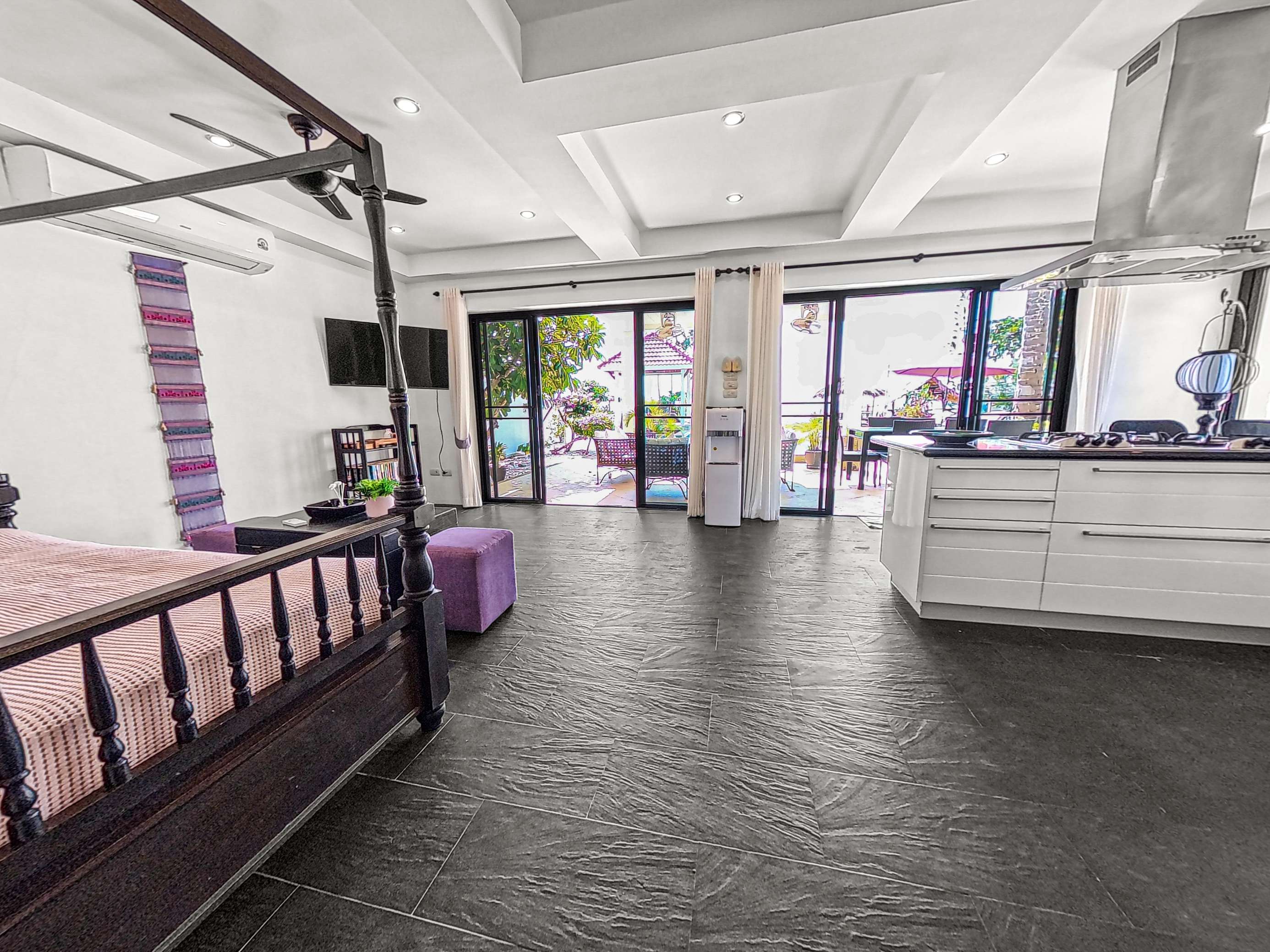 Inside, the home boasts open-concept living and dining areas, along with a fully equipped kitchen. Expansive glass doors allow for plenty of natural light and offer sweeping views of the sea and pool – ideal for both relaxing and entertaining.
