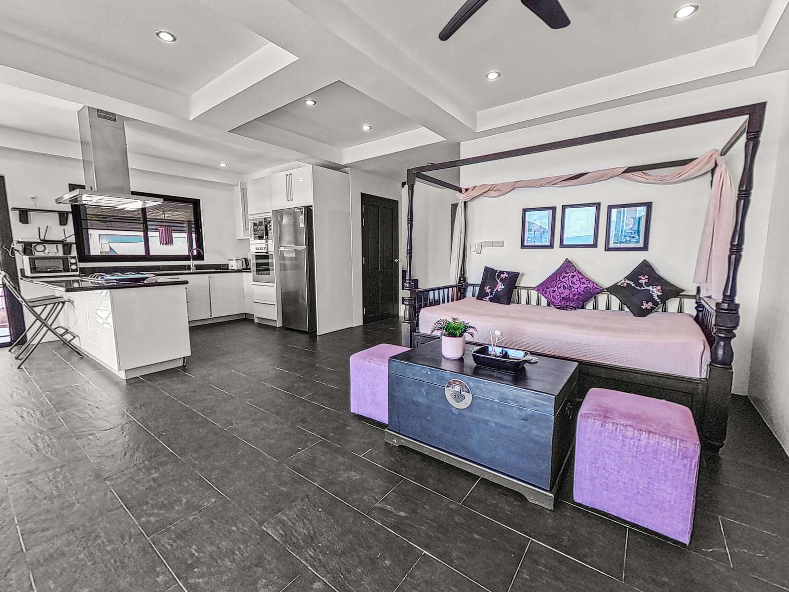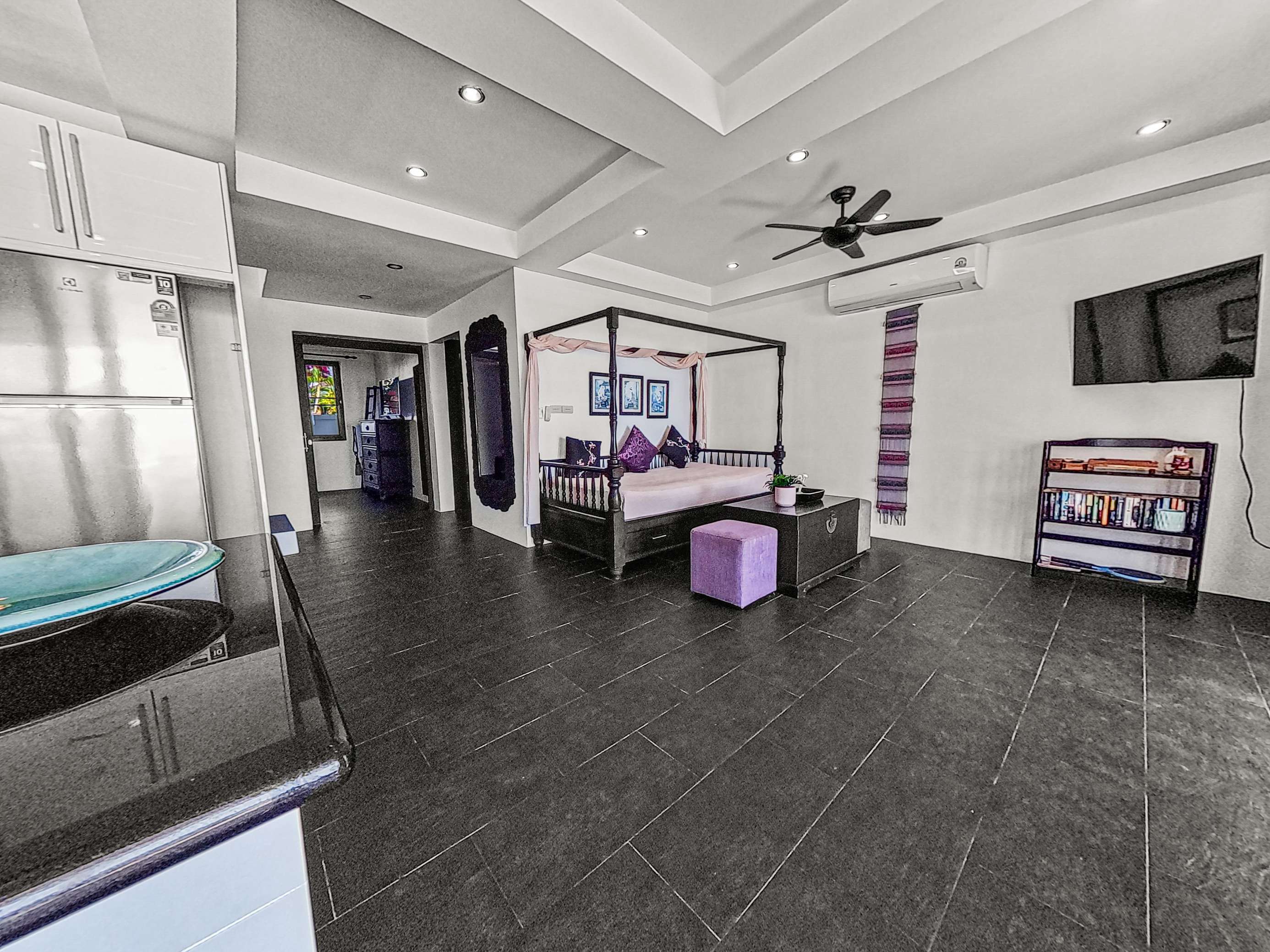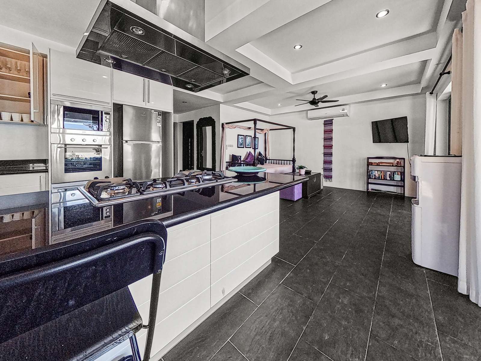 Inside, the home boasts open-concept living and dining areas, along with a fully equipped kitchen. Expansive glass doors allow for plenty of natural light and offer sweeping views of the sea and pool – ideal for both relaxing and entertaining.